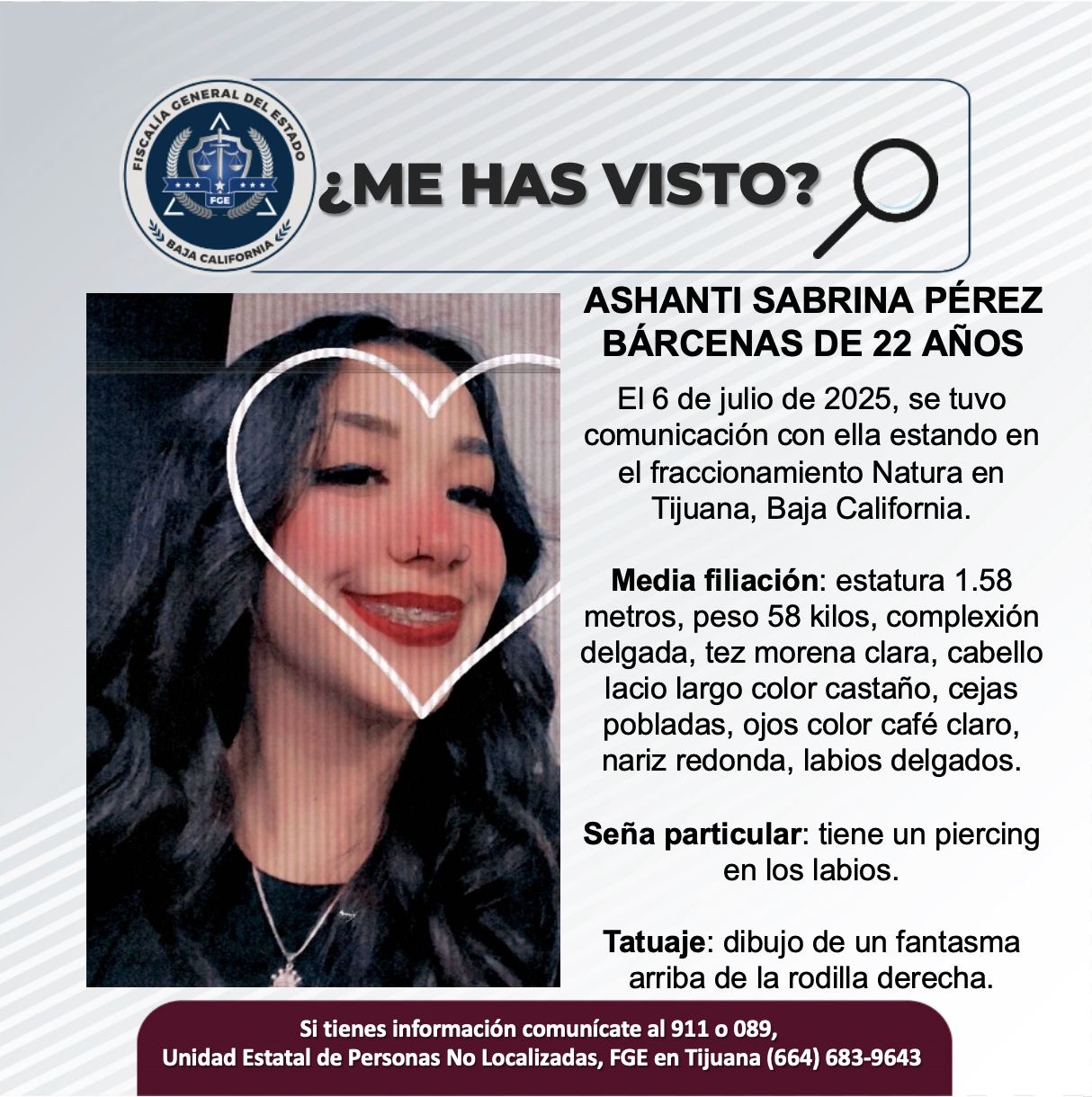TIJUANA.- La Fiscalía General del Estado (FGE), solicita el apoyo de la ciudadanía para localizar a Ashanti Sabrina Pérez Bárcenas de 22 años de edad.