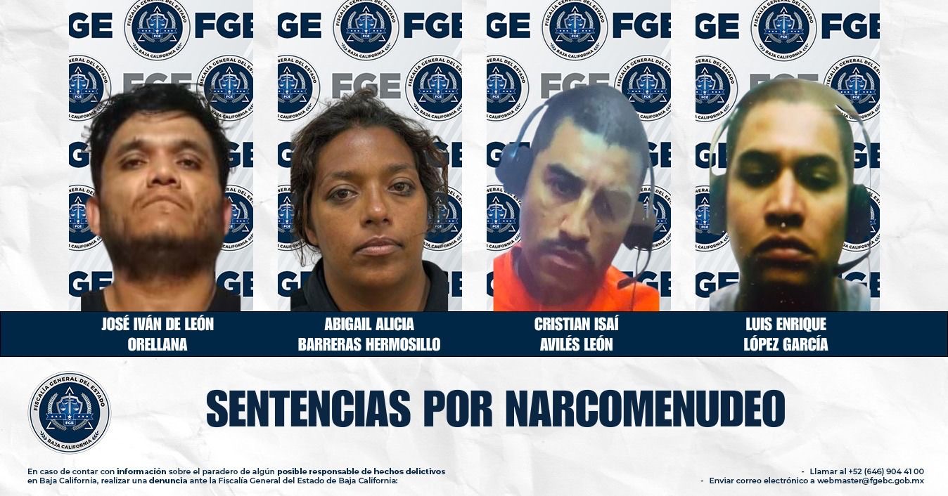 Los detenidos y sentenciados son Josué Iván de León Orellana, quien fue asegurado en la colonia Colinas de la Presa con 42 envoltorios de metanfetamina. Abigail Alicia Barreras Hermosillo, detenida en la colonia Mariano Matamoros con 13 envoltorios de metanfetamina.